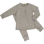 Nattøjet består af en nattrøje/natkjole og et par natbukser. Sættet er gråmeleret med prikker.