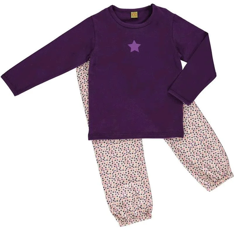 Nattøjet består af en nattrøje/natkjole og et par natbukser. Sættet er lilla med prikker.