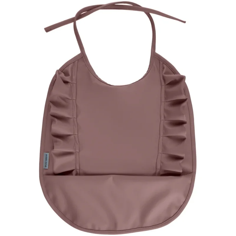 En vandtæt PU-hagesmæk er et nødvendigt tilbehør til babyer og små børn ved spisetid, da den beskytter tøjet fra at blive beskidt. Hagesmækkene har bindebånd, så den altid passer perfekt rundt om halsen, uden at de små selv kan hive den af. Denne hagesmæk er en kort model med opsamlingslomme og flot flæse detalje. Den er lavet med genbrugsmateriale.
