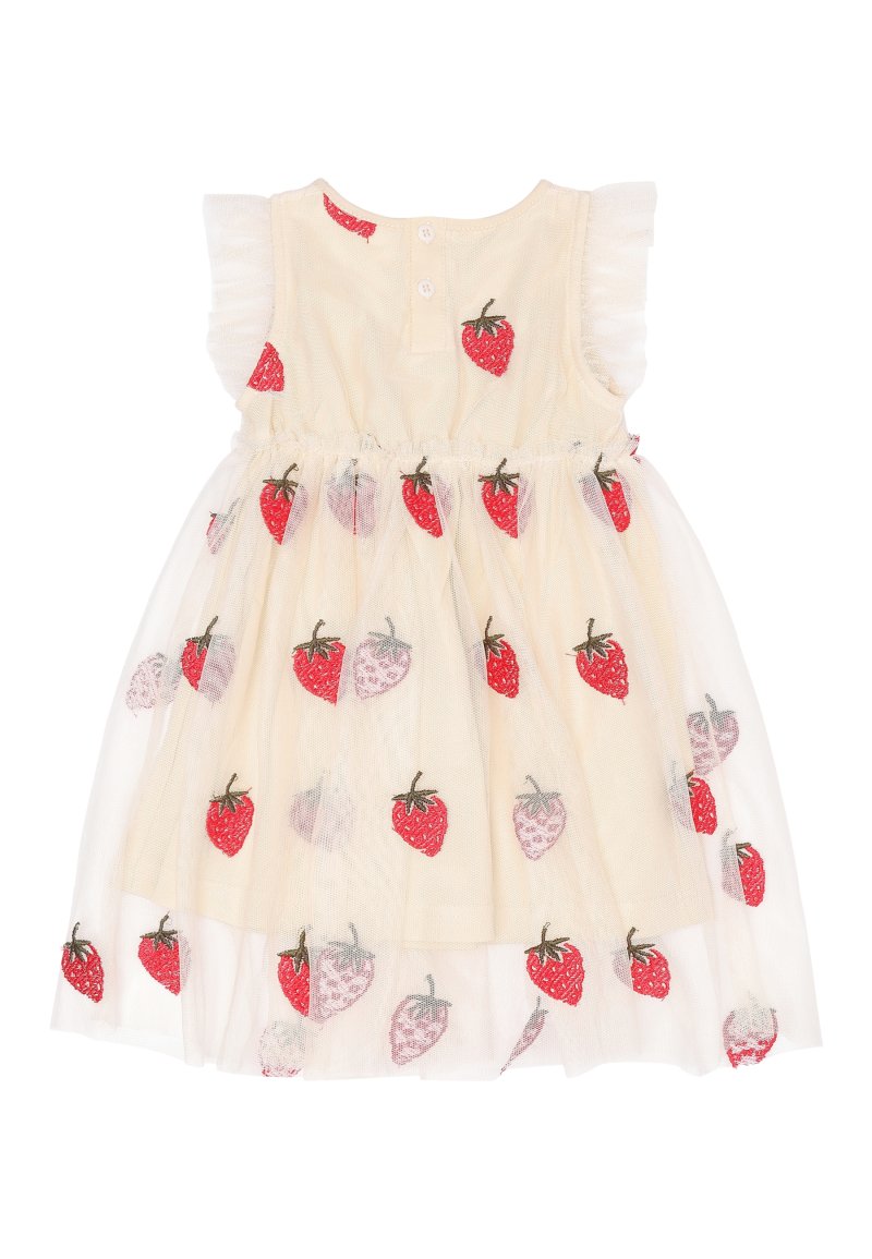 Denne i en fin mørk råhvid farve med mesh-skørte i tone-i-tone med broderi over det hele af jordbær.