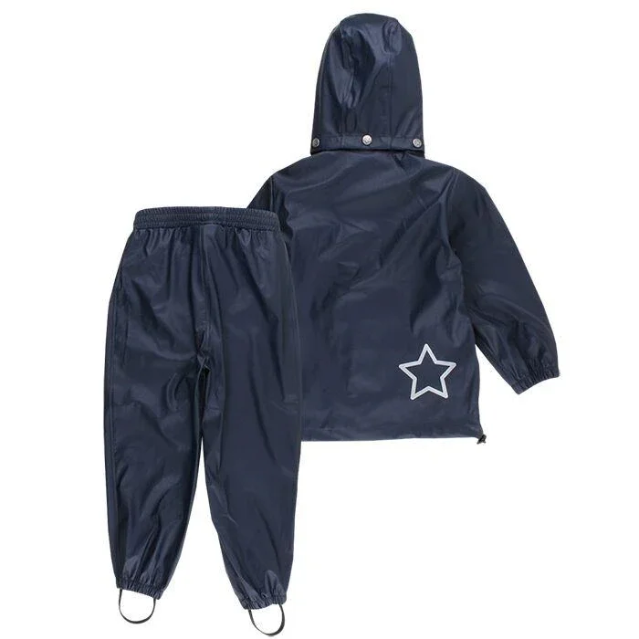 En Fant regntøj med seler i bukserne. Regnjakke er med aftagelig hætteog hætten har elastikkant for god pasform. Der er elastik ved håndleddene og jakken kan strammes med elastiksnøre i livet for den optimale pasform.